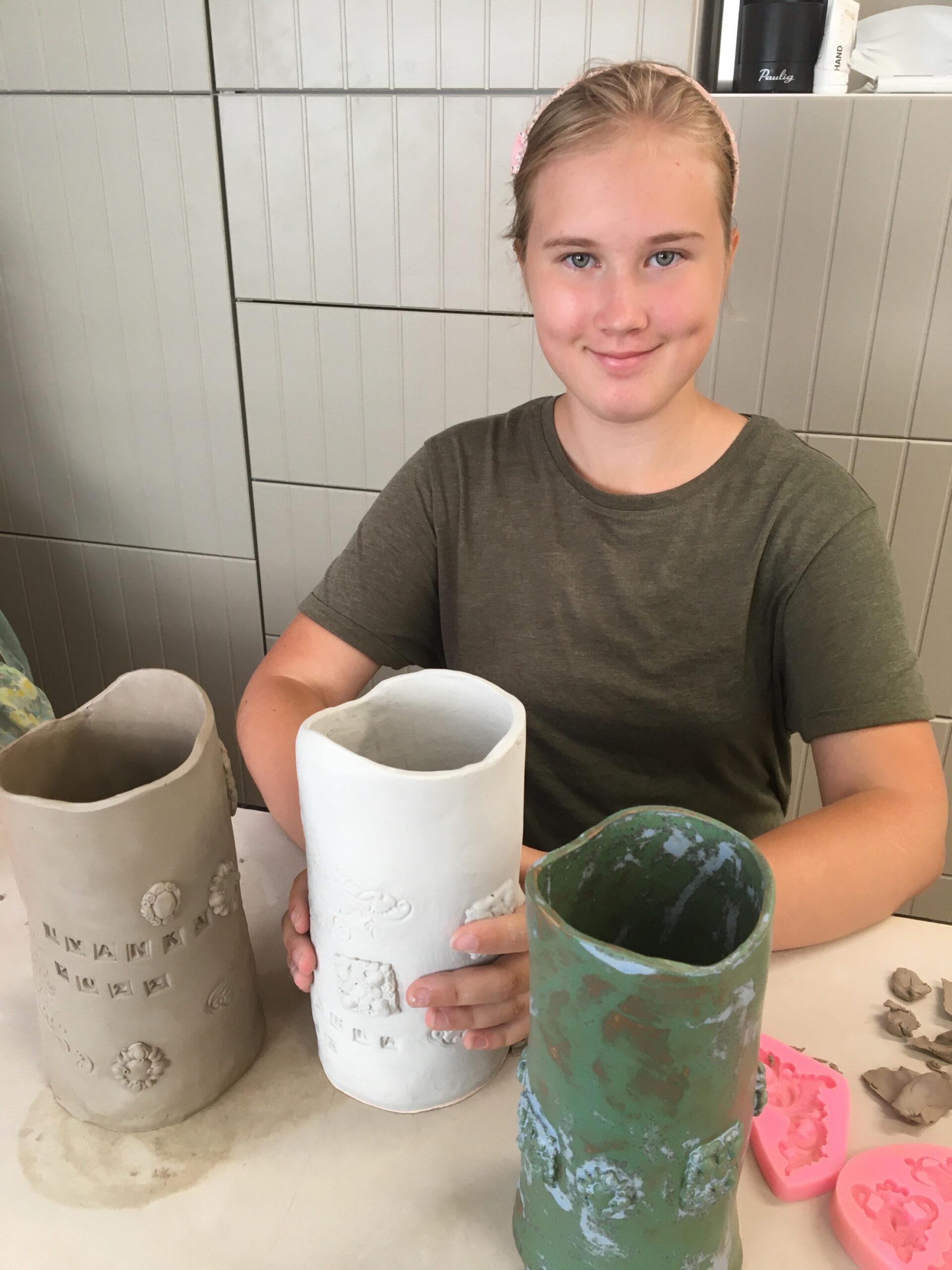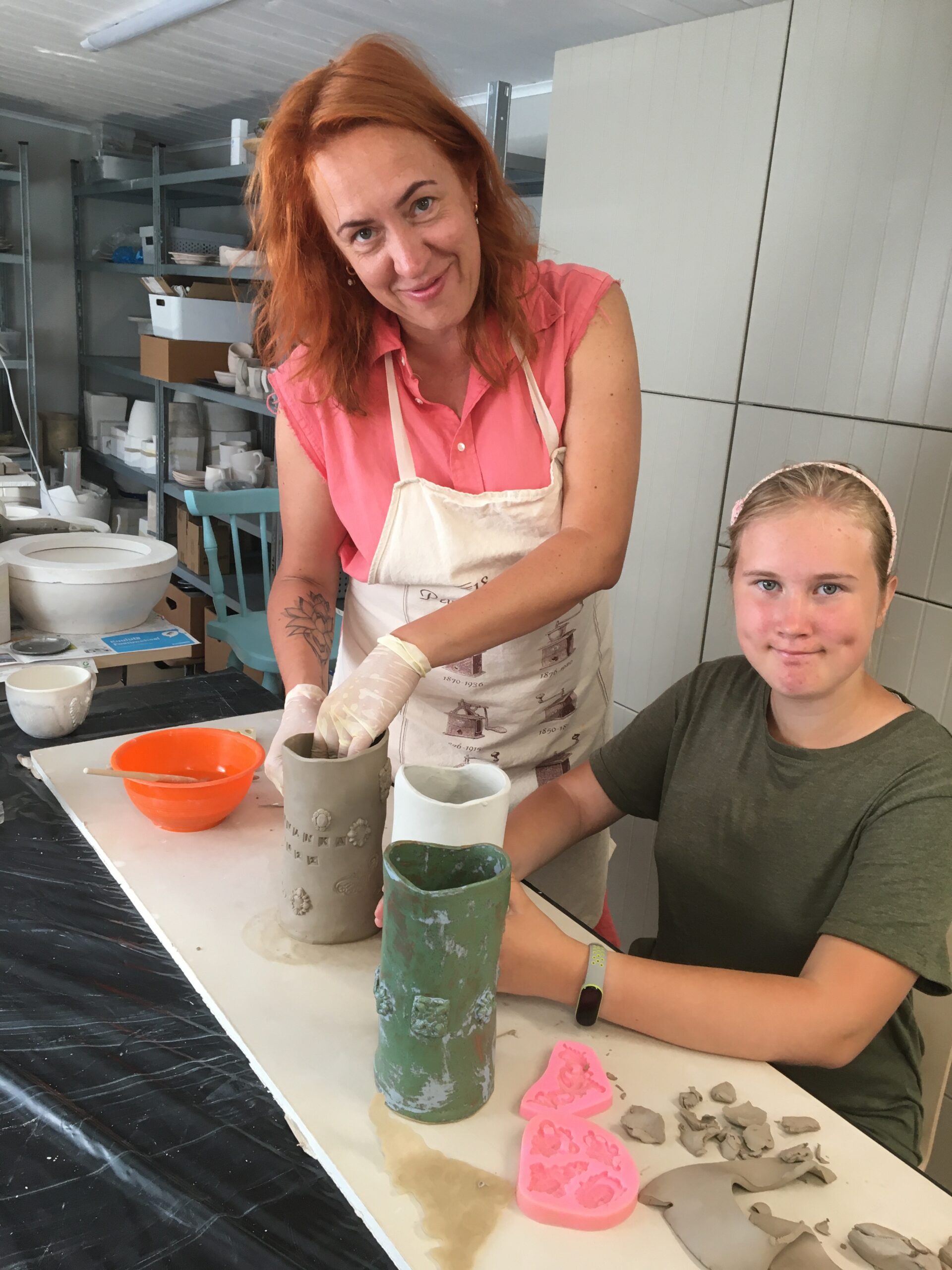 I really like to serve meals on handmade unique and original tableware! Me and Ivanka Shoshana have created several clay kitchenware. Also today we went to the clay class with Ivanka and once again many beautiful products are in progress. My current favourite is a freshly made multicolored vase and a small bowl that suits it. I don’t know how well the picture brings out their nature but they are exactly such warm simple cottage style kitchenware.